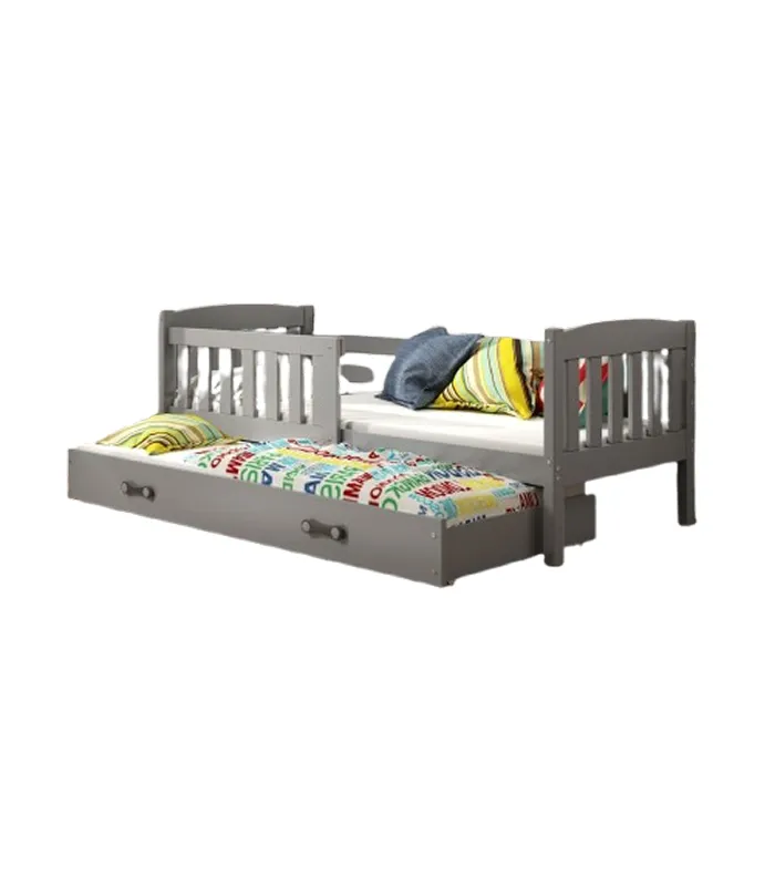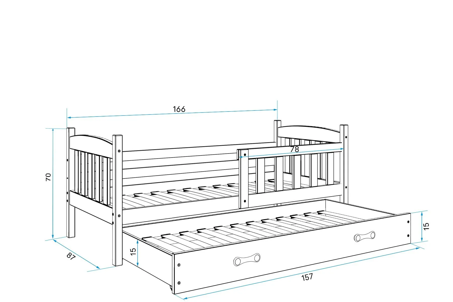 Krevet sa fiokom Dreamy je za ljude koji cene funkcionalnost, moderan dizajn i kvalitet izrade Njegov stabilan dizajn osigurava bezbednost i udobnost za vaše dete Okvir kreveta je napravljen od visoko kvalitetnog borovog drveta, što osigurava dugo i pouzdano korišćenje 1. Okvir kreveta – od borovog drveta, farban vodenim lakom 2. Pribor za montažu – brza i laka montaža 3. Krevet – kao jedina firma nudimo krevet od opružnih letvica od breze, pričvršćene PVC ručkom na metalnu letvu, klik-klak sistem (brza montaža) 4. Dušek – debljine 7 cm (2 kom.) sa poklopcem koji se može skinuti, klima vlaknima i poliuretanskom penom Navlaka – prošivena hipoalergena tkanina, od poliestera, sa patent zatvaračem 5. Fioka – od iverice 6. HDF ploča 7. Ručka fioke – od PVC-a 8. Točkovi za fioke 9. Zaokruživanje – poluprečnik R2 10. Nosivost – 100 kg po nivou 11. Sertifikovan krevet – kvalitet i bezbednost u skladu sa TUV standardima