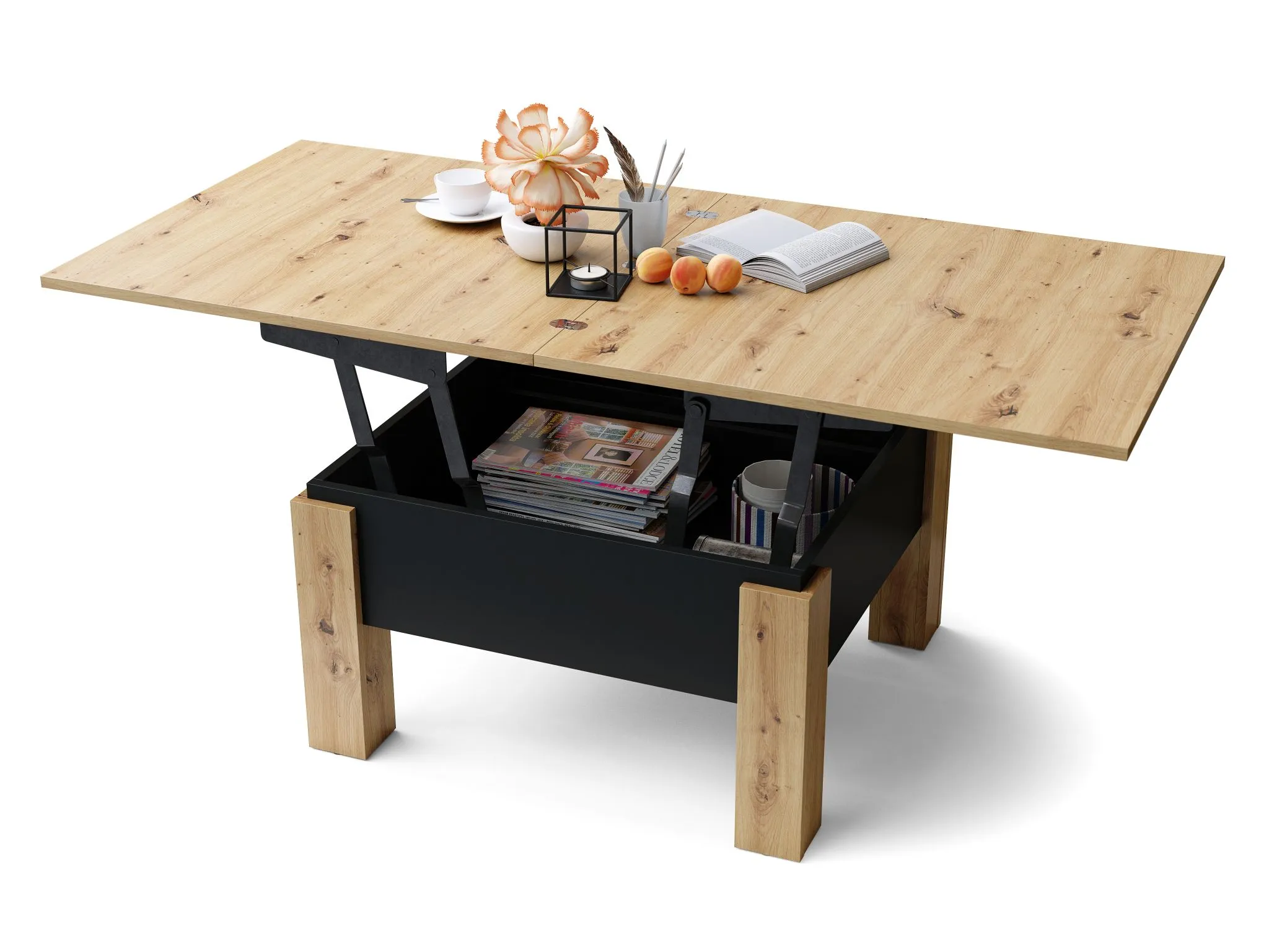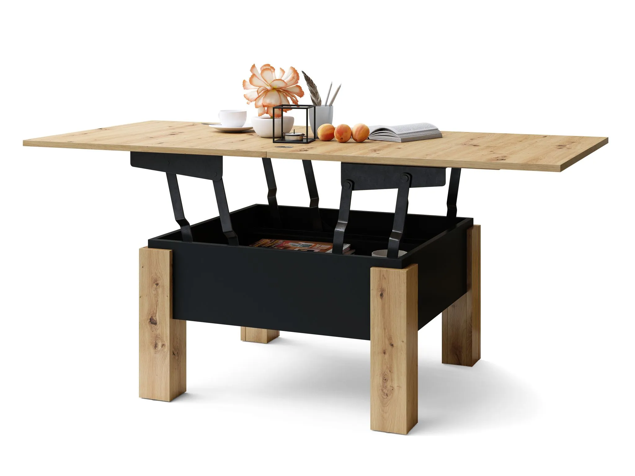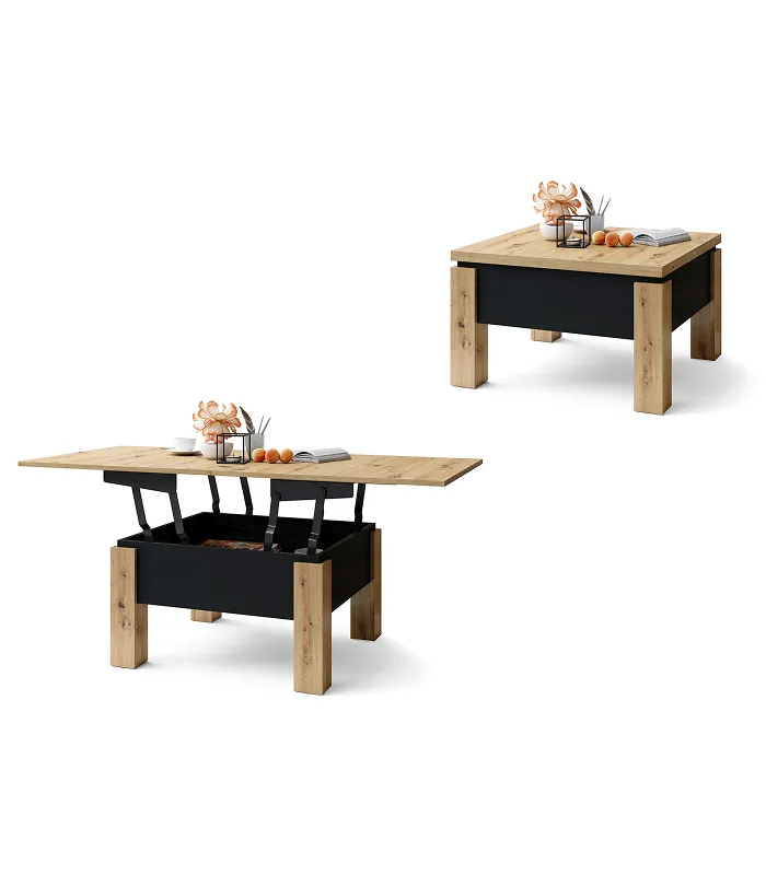 Ovaj stočić za kafu je savršen za male i srednje prostorije zahvaljujući svojoj kompaktnoj veličini. Njegova funkcija rasklapanja čini ga savršenim kao sto, pružajući optimalan prostor za svakodnevne aktivnosti poput porodičnih obroka ili radnog prostora. Ima uredan odeljak za odlaganje ispod ploče stola, osiguravajući da su sve neophodne stvari uvek na dohvat ruke. čitava konstrukcija počiva na četiri čvrste noge, što garantuje visoku stabilnost. Proizvedeno u EU – Poljska.