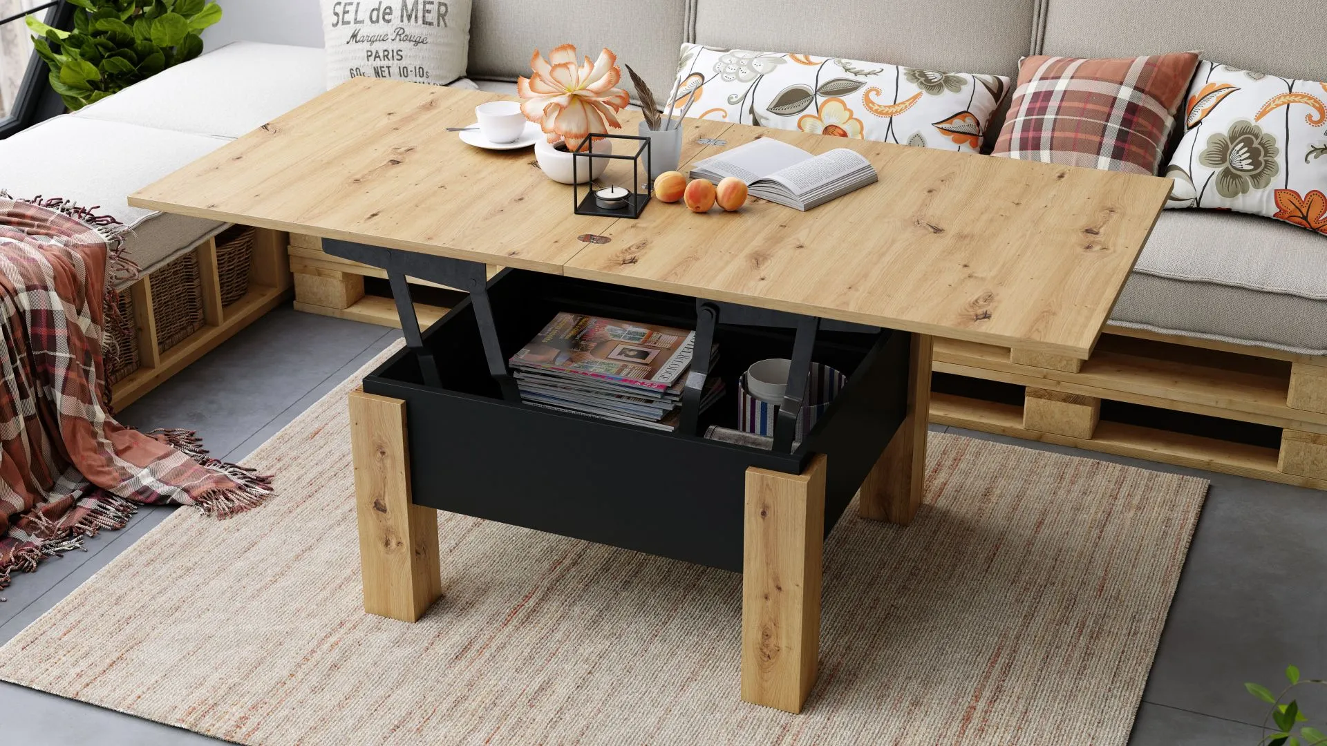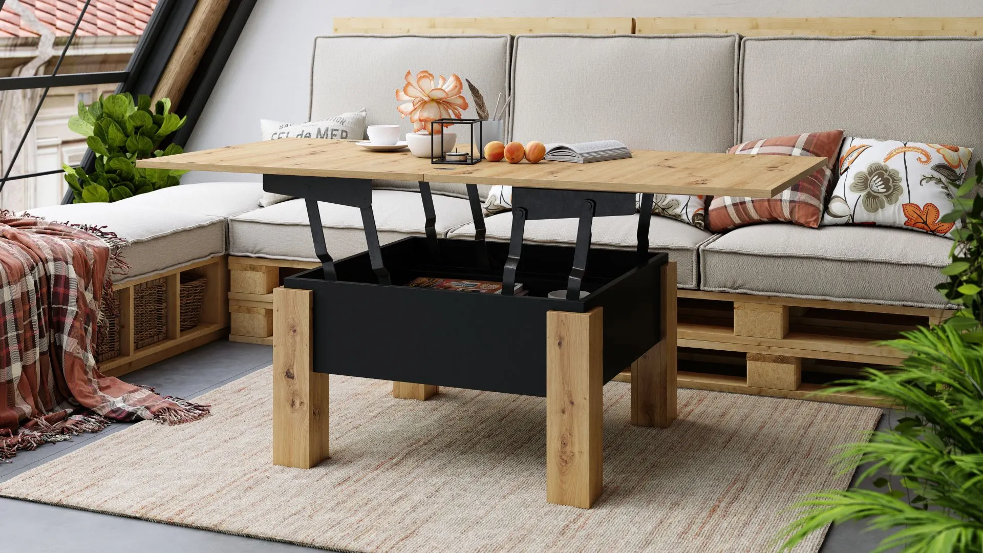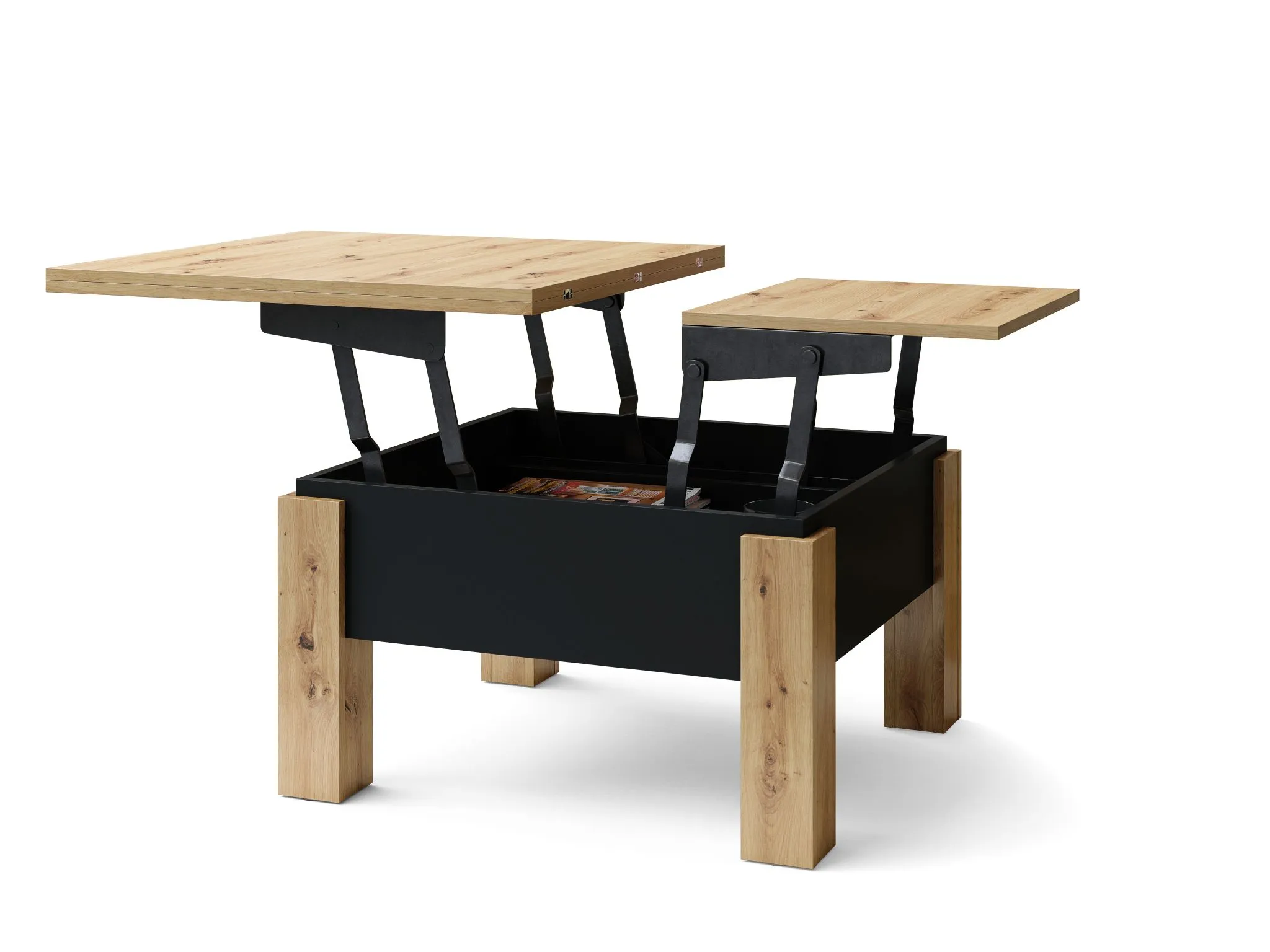 Ovaj stočić za kafu je savršen za male i srednje prostorije zahvaljujući svojoj kompaktnoj veličini. Njegova funkcija rasklapanja čini ga savršenim kao sto, pružajući optimalan prostor za svakodnevne aktivnosti poput porodičnih obroka ili radnog prostora. Ima uredan odeljak za odlaganje ispod ploče stola, osiguravajući da su sve neophodne stvari uvek na dohvat ruke. čitava konstrukcija počiva na četiri čvrste noge, što garantuje visoku stabilnost. Proizvedeno u EU – Poljska.