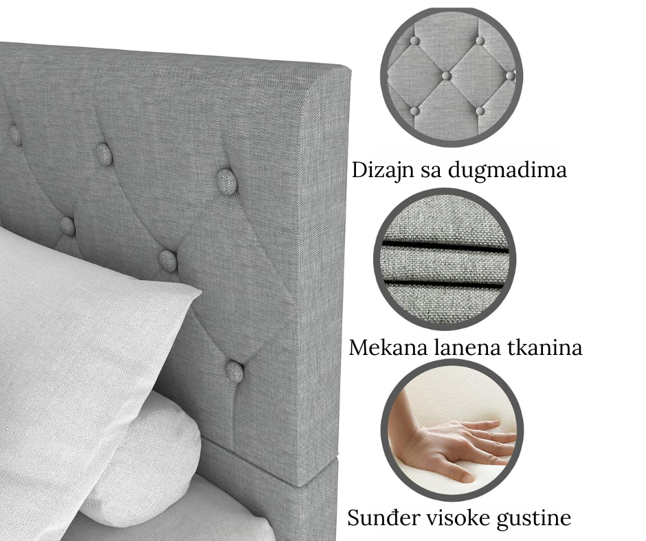 Krevet u čisto sivoj boji je napravljen od visokokvalitetne lanene tkanine, što zadovoljava uklapanje u prostor, daje prostoriji toplu i modernu atmosferu i jedinstvenu je boju sobe